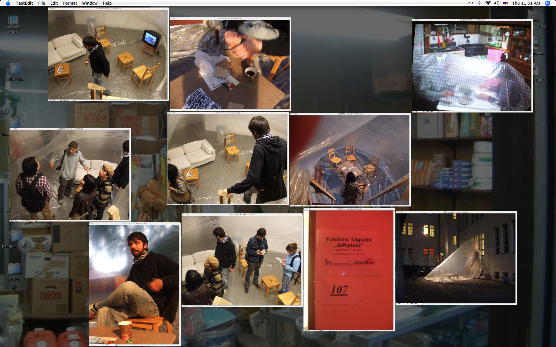 The image above (click it for a bigger spread) shows the inflatable plastic installation by young Berlin-based Japanese artist Yukihiro Taguchi, who's made a polythene tent that spills out of a room at the Japan Now site and into the courtyard. Yukihiro is there every day, wearing his trademark flat cap and serving his visitors tea.