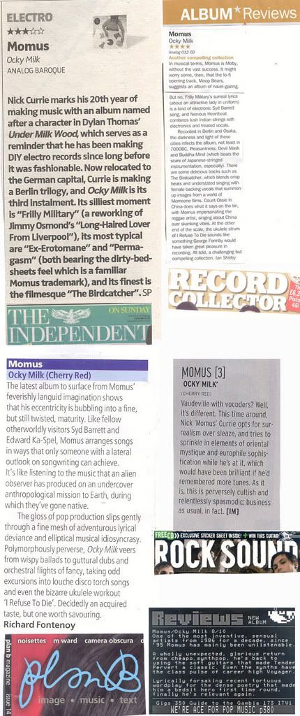 The last time Momus quoted some press about his current album Ocky Milk, some concerned passerby got defeatist on our asses. "Momus, are you seriously happy with the attention Ocky Milk has been getting?" wrote Mr Concerned. "I mean, a forum thread or two, a blog here, a Pitchfork-wannabe there... it's not exactly blanket coverage, is it? My kid brother's myspace electronica does as well. Not in any of the music mags (that I can find), not in Wire, not even in Pitchfork, let alone national newspapers or anything like that. While at the same time someone like Green Gartside gets a Mercury nomination. It's not a bad album, I guess you deserve better."